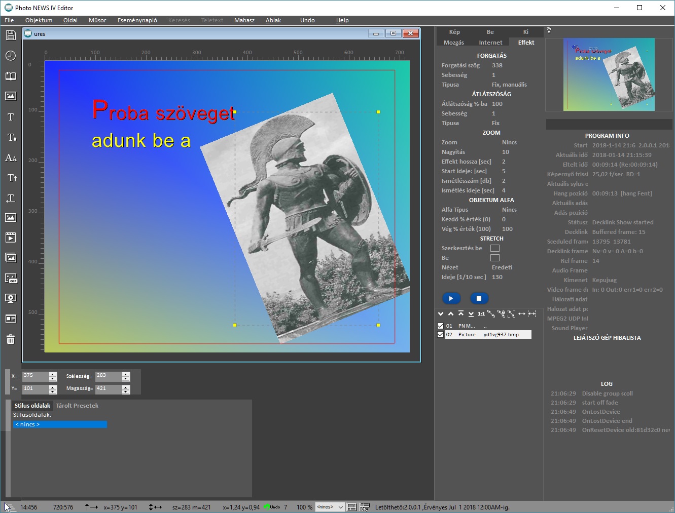 Objektumok:A program magyar nyelvű, és könnyen kezelhető. Tervezésénél kiemelt figyelmet fordítottunk arra, hogy minden beállítás menüből, vagy beállító ablakból elérhető legyen, így Önnek nem kell megtanulnia semmilyen scriptet hogy kezelni tudja a programot és nem kell a kézikönyvet bújnia hogy egy képet beszúrjon. A műsorszerkesztőben az elkészült műsor grafikusan jelenik meg, az egyes elkészült oldalak kicsinyített képe látható.