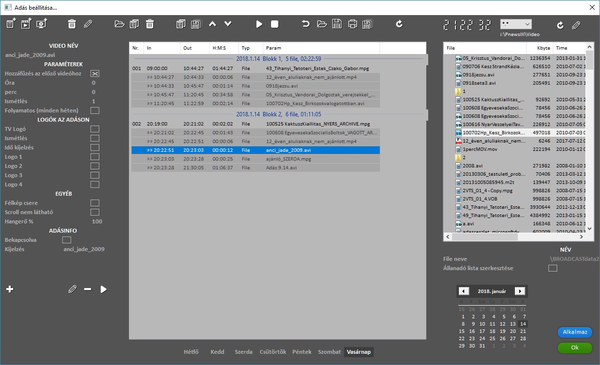 A programmal a gépen levő adás fileokból tud adáslistát szerkeszteni. Az adáslistát előre el tudja készíteni, illetve menet közben is módosíthatja. Az adáslistában tetszőleges számú adás videót tud elhelyezni, ezek sorrendjét bármikor meg tudja változtatni. Miden egyes adás filenál állíthat logókat, félképet, trimet. A felvitt adásoknál egyből hozzá tudja füzni a Médiahatóság számára szükséges információkat (pl. ismétlés, saját gyártás, AGB kód, stb.), igy az elkészült adás listából egy kattintással tud Médiahatóság által elfogadott lejátszási listát generálni. Ha az adás indulásakor még a híradó vágás alatt van, az sem probléma, egy dummy file-al tudja helyettesíteni, amit a vágás végeztével felül tud írni, A program az új file paraméterei alapján módosít, és lejátssza a listát.